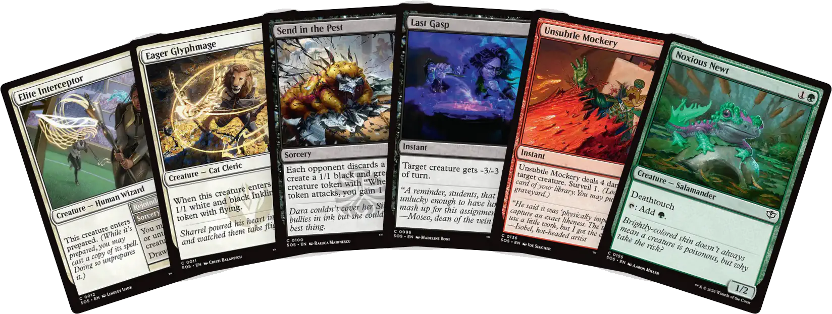 Per quanto riguarda le comuni, la mia selezione delle sei migliori del set include Elite Interceptor, Eager Glyphmage, Send in the Pest, Last Gasp, Unsubtle Mockery e Noxious Newt. Tre di queste offrono rimozioni pulite o una presenza efficiente sul board: Eager Glyphmage, Last Gasp e Unsubtle Mockery. Le altre tre sono ottime giocate nei primi turni in qualsiasi Limited, ma brillano soprattutto per il loro potenziale sinergico. Elite Interceptor aiuta ad attivare Repartee, Send in the Pest abilita Infusion e Noxious Newt accelera il mana per supportare le strategie basate su Increment. Queste comuni rappresentano le fondamenta del formato.