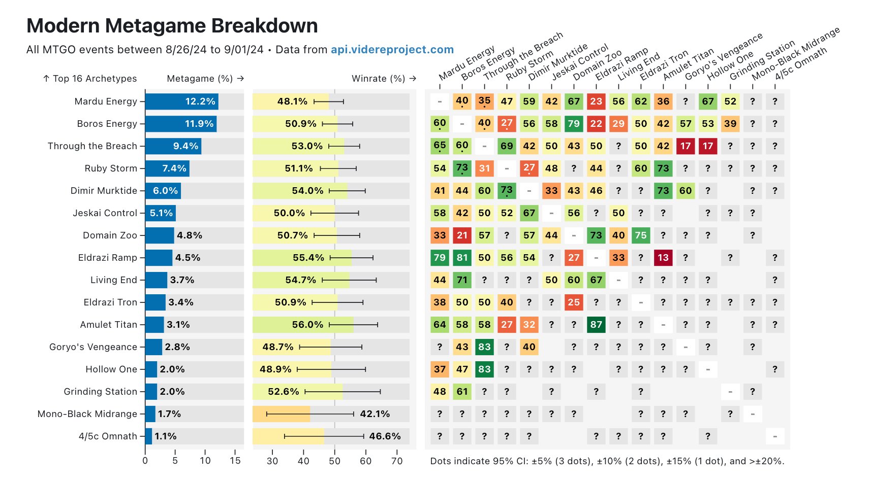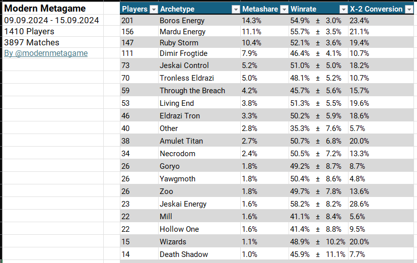 Come si mostra il Modern quindi dopo il ban di Nadu, Winged Wisdom e Grief? Come potete vedere dai grafici e tabelle riportate (per gentile concessione di @TheQonfused, @AnaelYahi e @modernmetagame che vi invito a seguire su Twitter), il formato non è che sia poi cosi vario come ci si sarebbe aspettato o immaginato. Sommando le varianti di Energy, abbiamo un buon 20% del formato preso d’assalto da Guide of Souls, Ocelot Pride e Ajani, Nacatl Pariah, seguiti a netta distanza da Ruby Storm, varianti Eldrazi, Frogtide, Jeskai e via via il resto del formato. La situazione è migliorata rispetto al dominio incostratato di Nadu, ma questo non significa che il formato sia “sano”, tutt’altro. Modern dopo l’avvento di MH3 resta comunque poco divertente e varia da giocare, pur essendoci tanti mazzi “giocabili”, quelli effettivamente competitivi si possono contare sulle dita di una mano. Se vogliamo rincarare la dose, seppur Boros Energy sia un mazzo interattivo per design, visto l’indole midrange dello stesso, molte partite sembrano completamente non interattive, con pochissime scelte e definite da partenze a strappo a cui è difficile rispondere in modo efficiente. E questo vale per la maggior parte dei mazzi sopra elencati: Ruby Storm che chiude di secondo, FrogTide che risolve una rana di secondo e la protegge con infiniti counterspells mentre continua a pescare carte, Eldrazi che capitalizzano vantaggio mana tramite Kozilek’s Command, Sowing Mycospawn, Ugin’s Labyrinth ed Eldrazi Temple, Amulet che parte Urza’s Saga