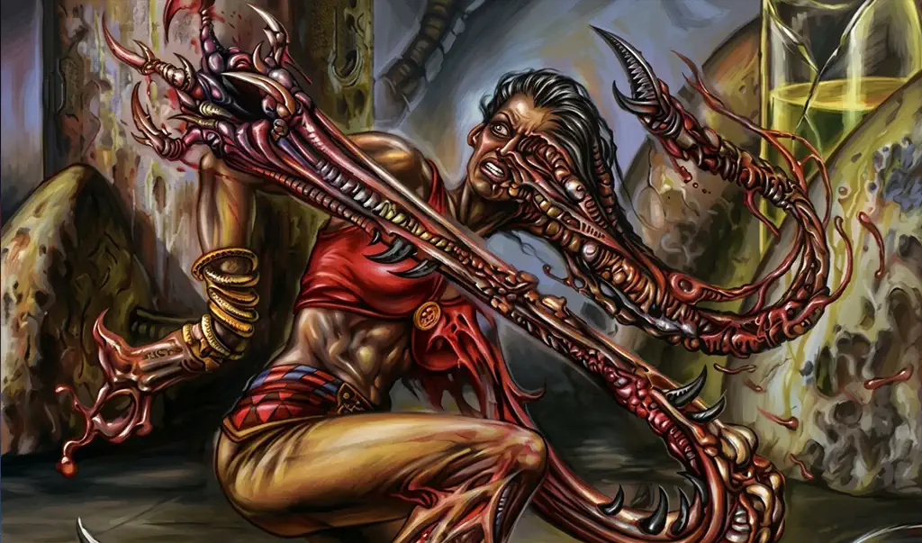 Nel caso della FEB combo, il motore è Survival of the Fittest. Grazie a Survival, il mazzo può scartare creature dalla mano, cercare dal grimorio quelle necessarie e, soprattutto, sistemare la cima del cimitero nel modo corretto per far lavorare lo Shapeshifter. La prima creatura chiave è Phyrexian Devourer. Quando è in cima al graveyard, Volrath’s Shapeshifter può esiliare carte dalla cima del grimorio per accumulare segnalini +1/+1 pari al costo di mana convertito delle carte esiliate. La seconda creatura chiave è Triskelion, che permette di convertire quei segnalini in danni diretti e chiudere la partita.
